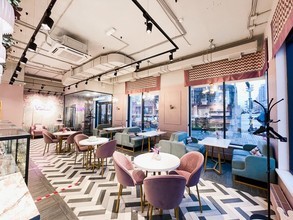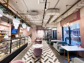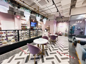 Заведение расположилось на первом этаже элитного жилого комплекса «Forum Group». Внутри очень уютный интерьер, оформленный в пастельных тонах. Гости могут комфортно разместиться возле больших окон на мягких диванчиках небесно-голубого цвета или за круглыми столиками на удобных розовых креслах. Рядом со входом также есть фотозона, где можно сделать эффектные снимки для социальных сетей.